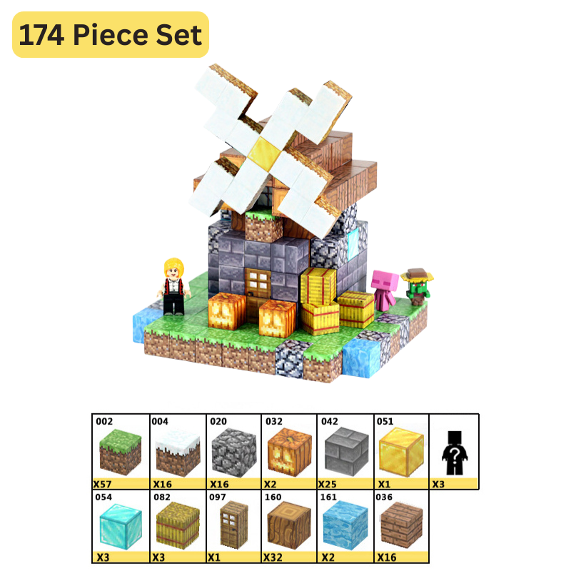 Bring rustic charm to your Minecraft-themed creations with the Windmill Cottage Set. This 174-piece collection includes 12 unique block types and 3 characters, perfect for building cozy cottages, spinning windmills, and countryside scenes.